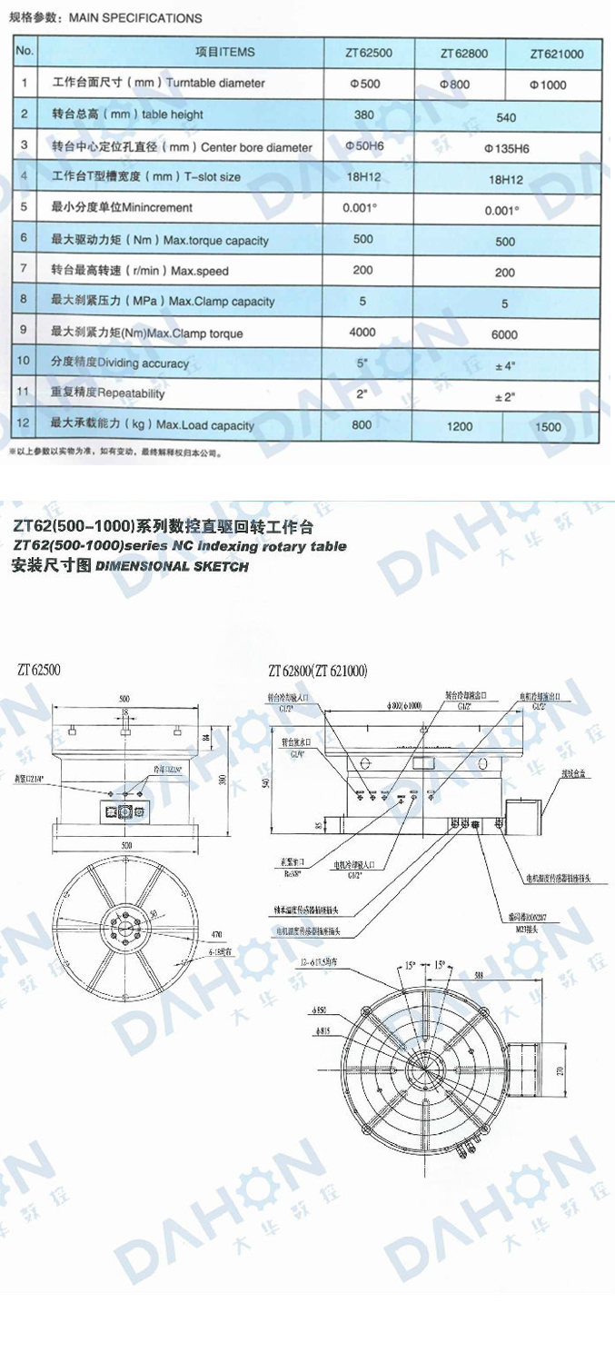 ZT62數控直驅回轉工作臺采用大扭矩力矩電機直接驅動,編碼器為反饋信號,可實現高精度的旋轉定位,是數控鏜銑床和加工中心的理想配套附件。工作時,在主機相關控制系統控制下,能夠完成與主機相協調的各種必需的分度回轉運動,實現等分、不等分的連續孔槽、曲面的加工,且達到較高的精度。